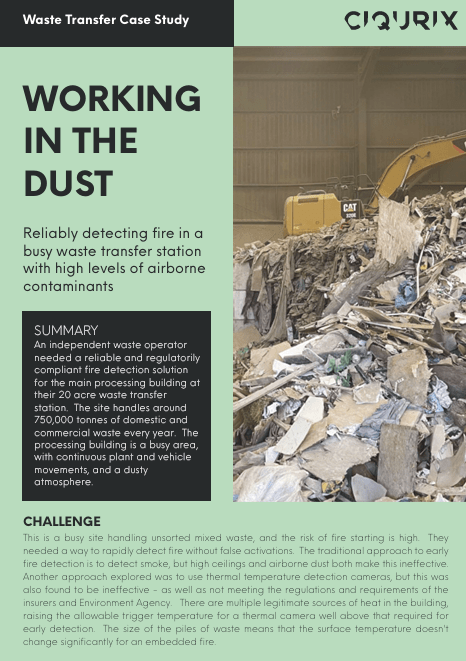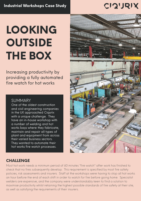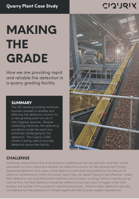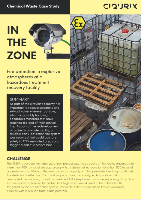 Traditional fire detection methods are facing significant challenges and failing to adapt. Buildings are increasing in size and complexity, industrial processes are no longer an excuse for slow or non-existent detection, and environmental concerns are necessitating fire detection in areas that were previously ignored. Ciqurix video flame detectors can recognise a fire at its inception and immediately raise the alarm. Using a combination of visual and infrared image processing, even small flames are located and detected over large distances in seconds. The system will rapidly detect fire almost anywhere. It is unaffected by dust, dirt, fumes, moisture, light levels, or temperature.
